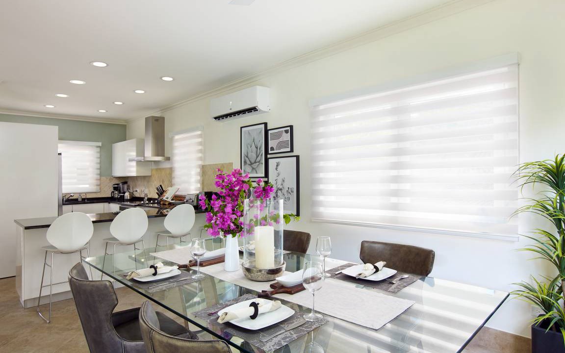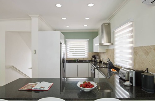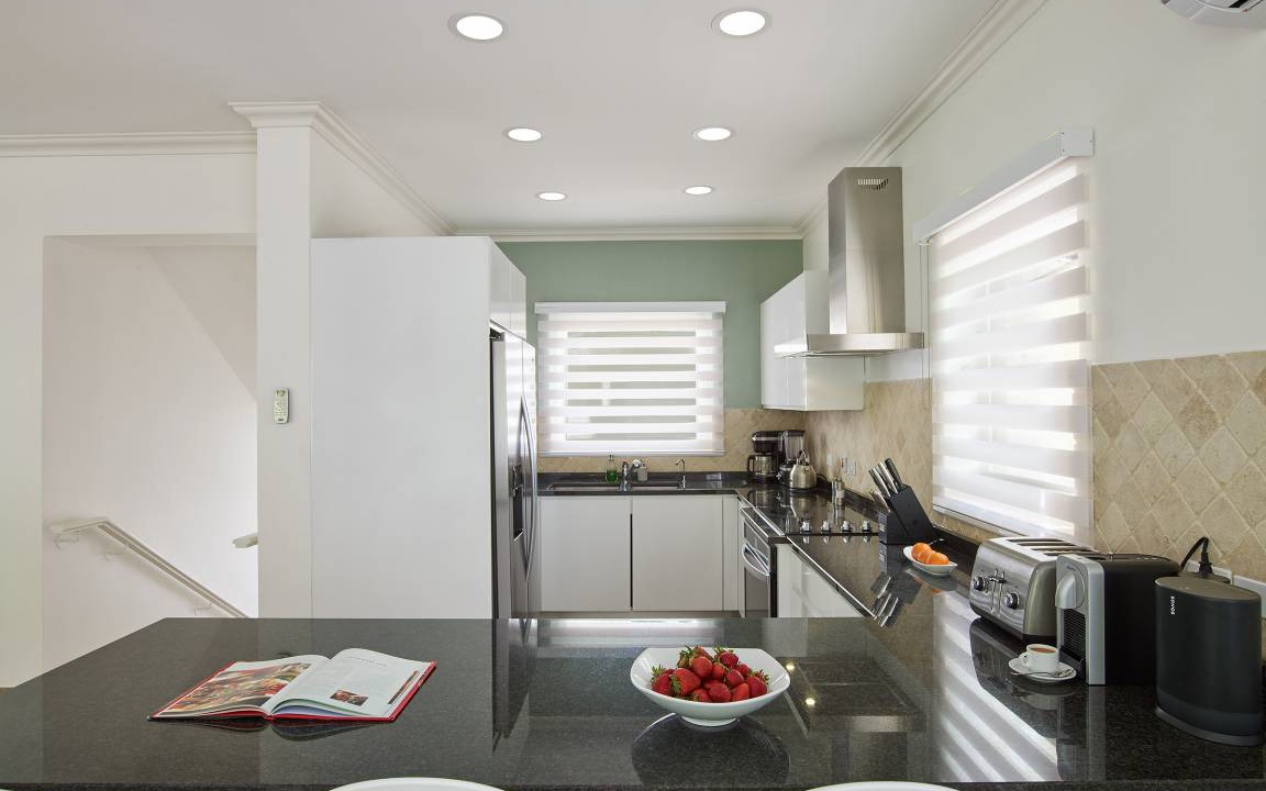 The 1st floor is also air conditioned and has an open plan Kitchen, Living room & dining area as well as a powder room and a covered outdoor terrace for dining or relaxing. The modern kitchen is fully equipped with high end appliances, a breakfast bar and granite countertops. There are also ceiling fans throughout the unit.