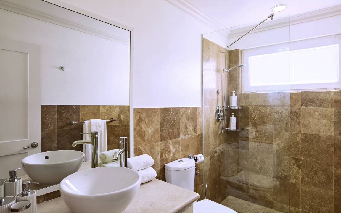 This three story, two bedroom townhouse boasts a modern interior with a fully equipped kitchen. The ground floor consists of two air conditioned Double Master Suites and equal in size but different configuration with en suite bathrooms and large doors that open into the garden. Bedroom 1 can be prepared as Twin beds that can also be converted into a king bed, with a walk in closet and en suite bathroom with shower. 2nd bedroom has a king bed, closet and en suite bathroom with shower.