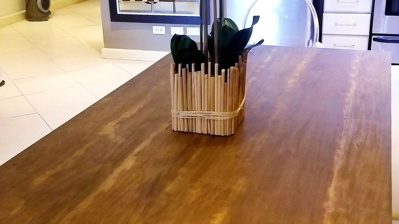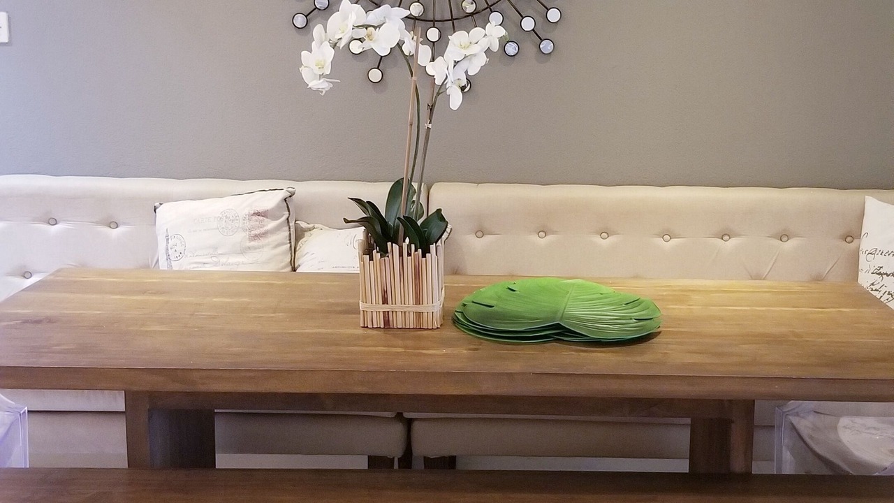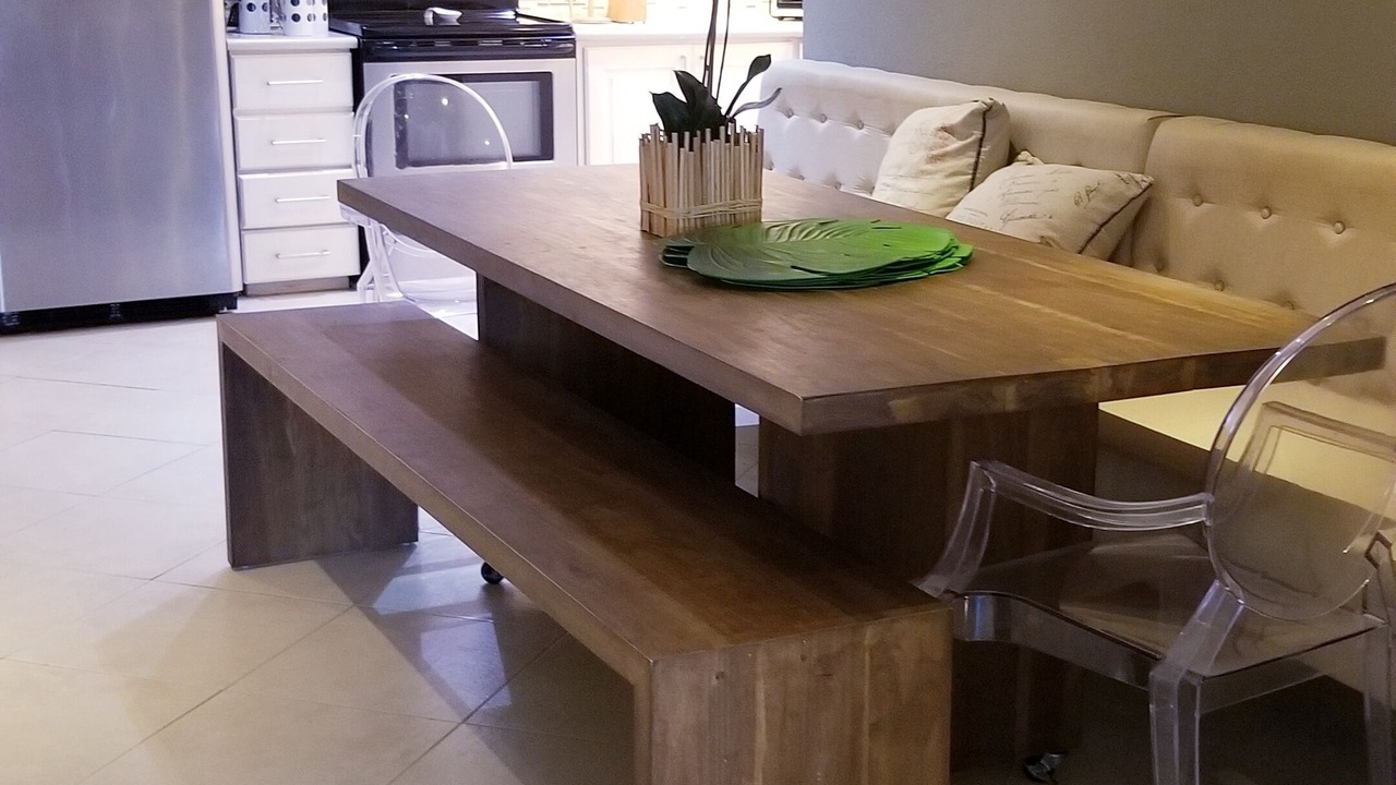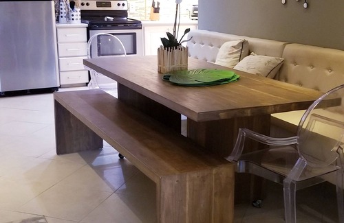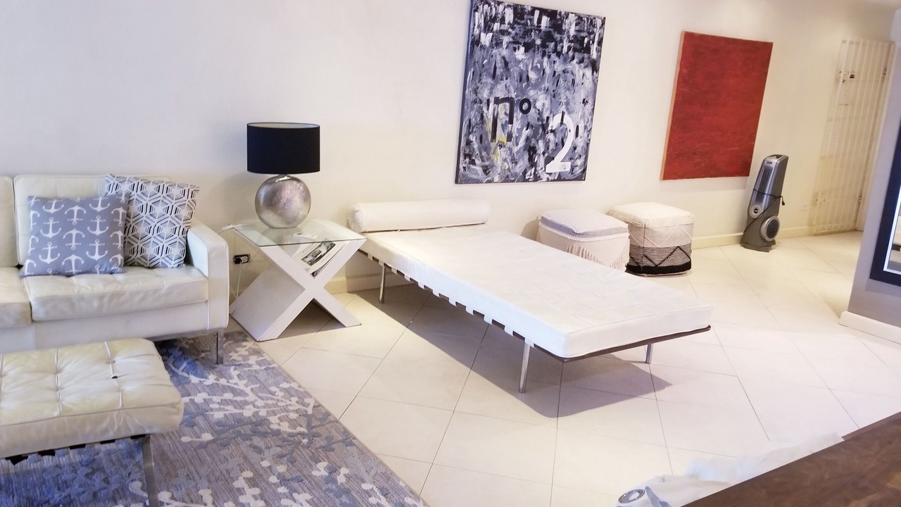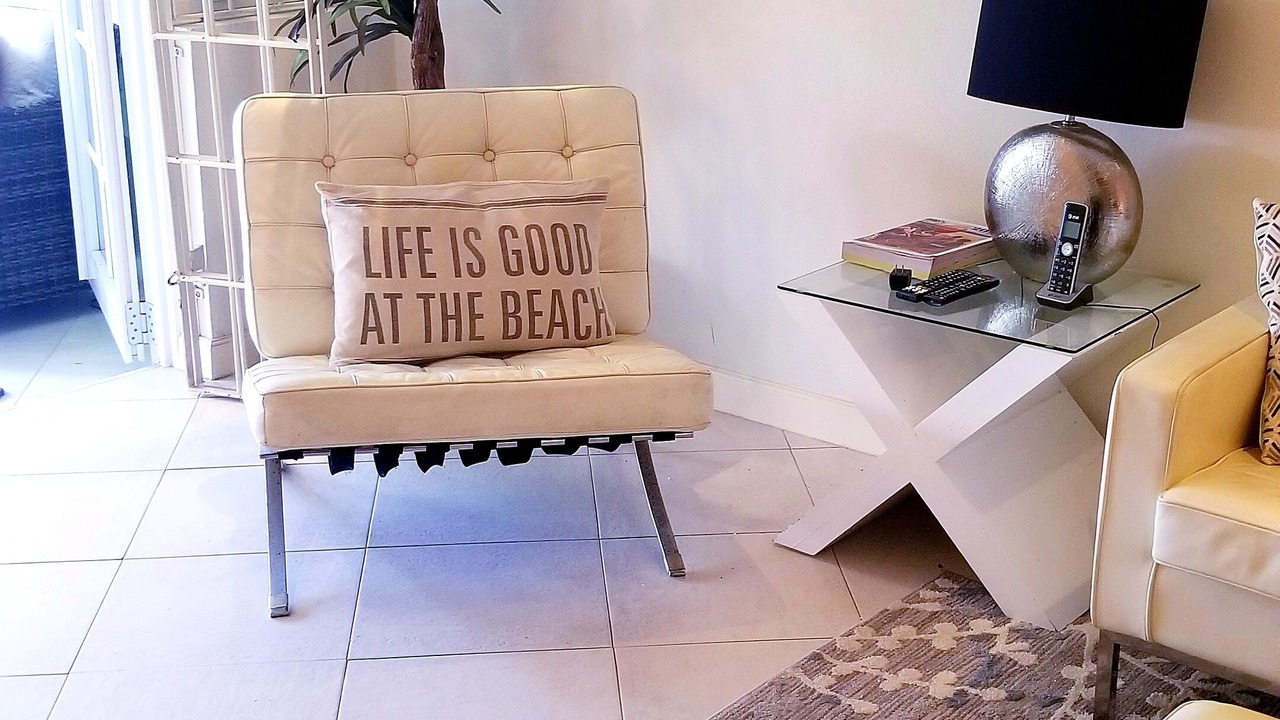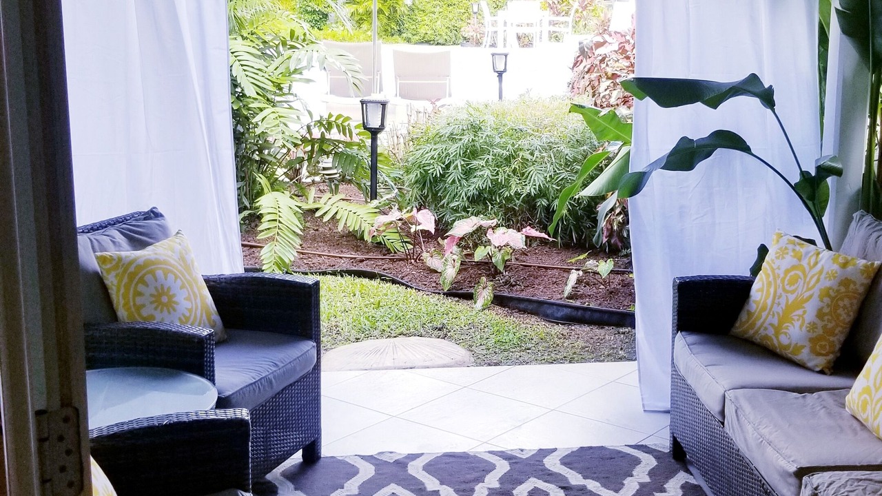 • The condo has a combined dining and living area with modern contemporary furnishings. There is a beautiful private covered patio with chairs and a chaise lounge. This patio walks out to the pool.